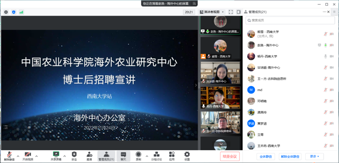 2022年11月24日下午,中国农业科公司海外农业研究中心博士后招聘宣讲会——beats365官方网站站顺利举行。中国农业科公司海外农业研究中心办公室主任毕洁颖、中国农业科公司农业信息研究所人事处副处长王一方、中国农业科公司海外农业研究中心人力资源官员赵鱼博士,beats365官方网站经济管理公司党委副书记田丽、农林经济管理系主任杨丹教授、农林经济管理系教师熊雪博士及博士研究生30余人参加了会议。宣讲会由杨丹主持。