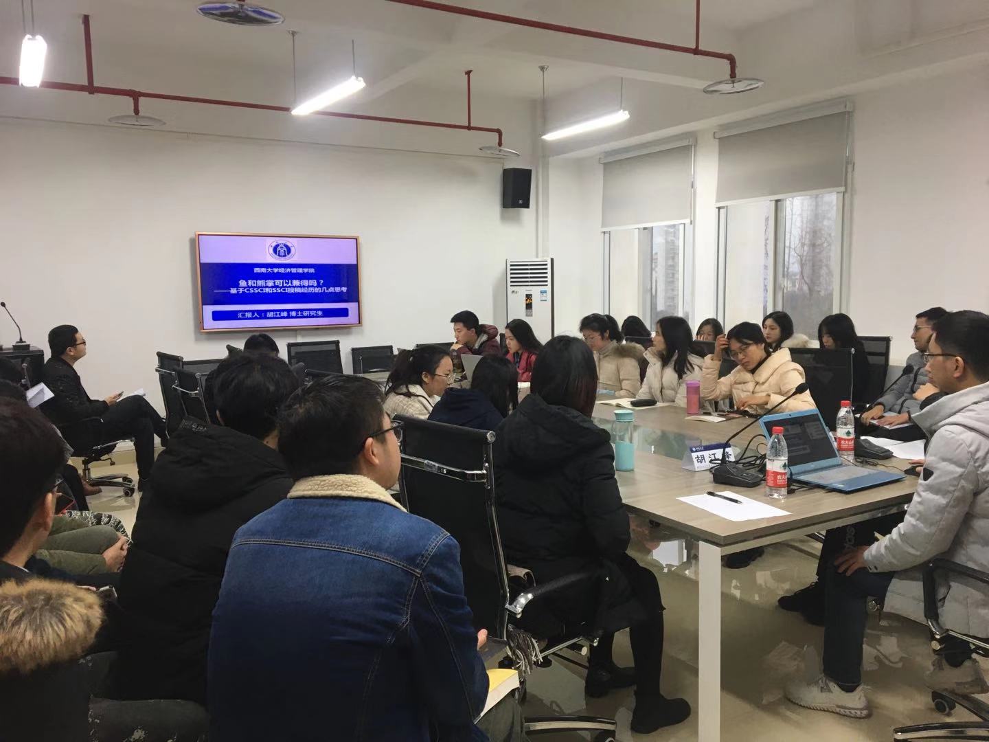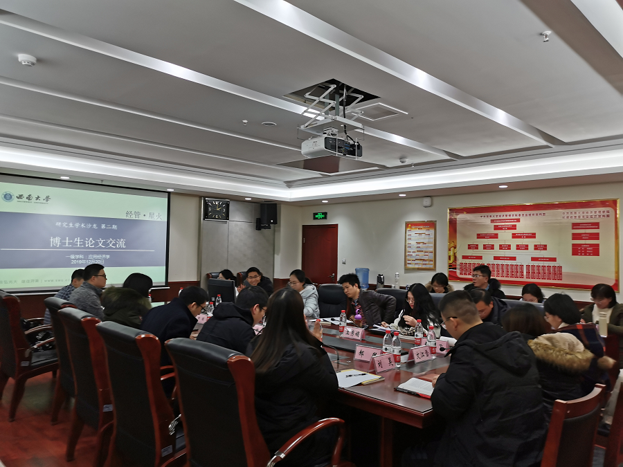 博士生学术沙龙在学院A204会议室进行,主题为博士生论文分享,2018级博士生王永仓、2019级博士生兰秀娟展示论文《数字金融与经济增长》和《成渝城市群工业集聚对工业生态效率影响研究》,公司张林副教授、黄磊博士担任点评人,沙龙由2019级博士生王蓬主持,公司党委副书记田丽老师和公司博士生参加。张林老师、黄磊老师对两位博士生的论文进行耐心细致的点评,指出论文标题应当简洁、准确,绪论部分不宜过长,推导结论时应注重逻辑连贯正确,师生们围绕论文主题进行深入地探讨和交流。田书记对两位点评老师和博士生的精心准备表示感谢,希望大家珍惜学术沙龙的机会,向老师和同学学习,不断提高学术能力。