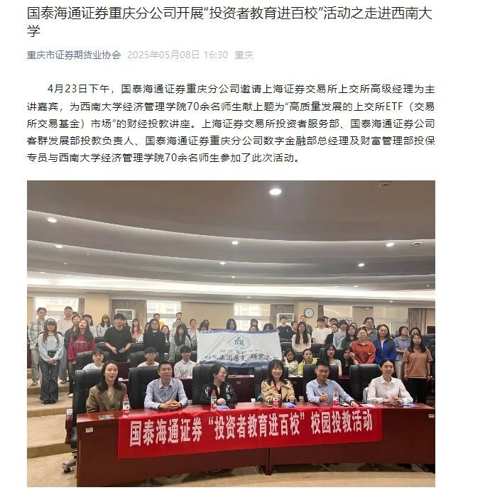 近日,中国网、中国日报网等多家媒体报道了在公司开展的2025“上证杯”校园宣讲活动,该活动由上海证券交易所主办,国泰海通证券等金融机构为专业支持,活动于4月23日在公司开展。活动促进了公司与上交所等金融机构的友好合作,加强了公司师生与国民财经素养教育的深度融合。
