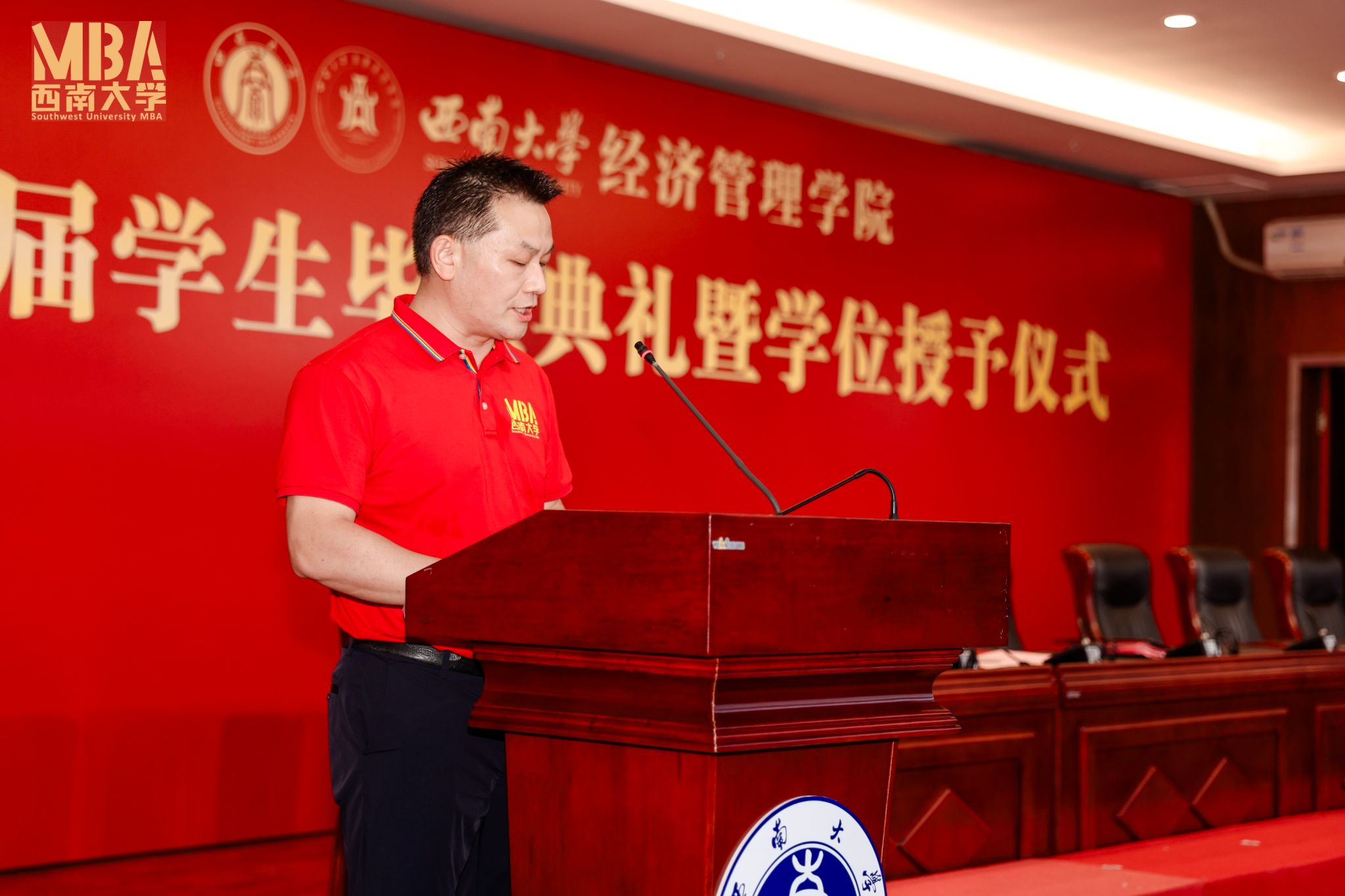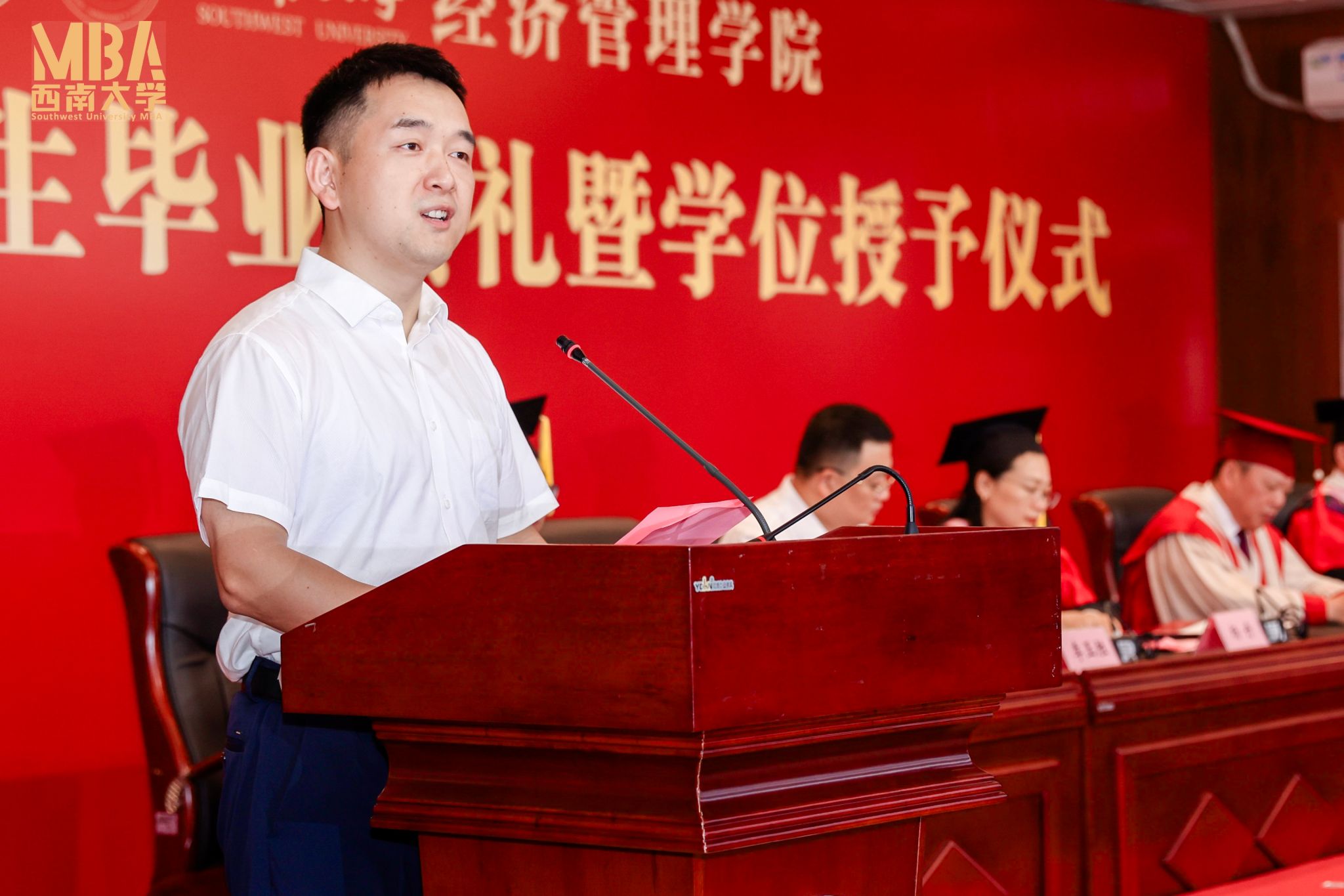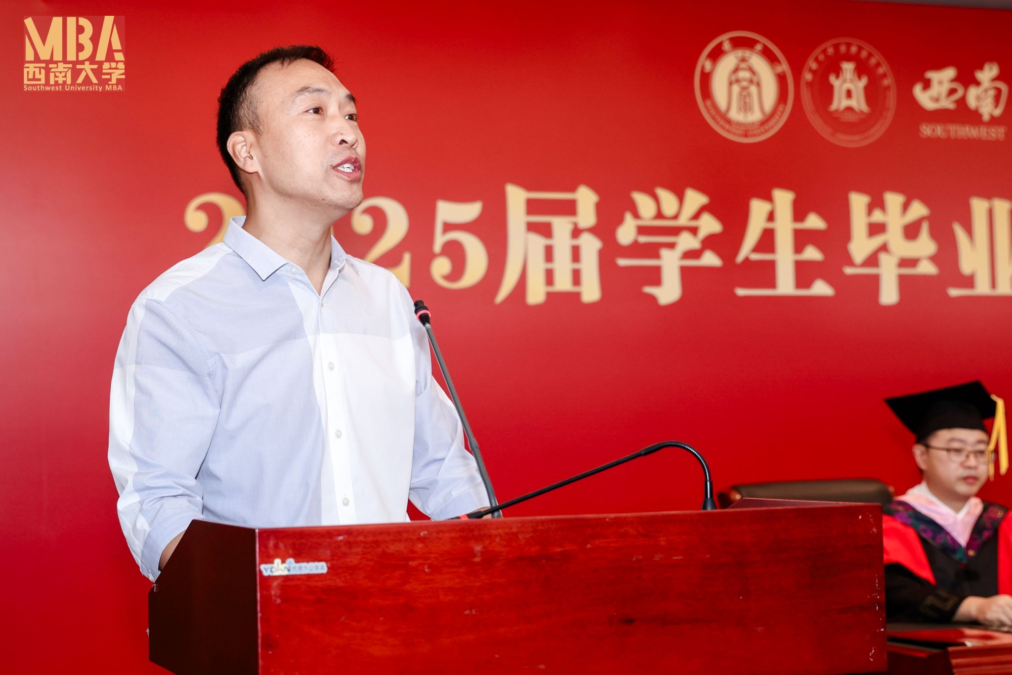 毕业生代表2022级智达班的张艾琦同学在毕业典礼上分享了三年来兼顾工作、家庭与学业的奋斗时光。他回顾了在职攻读MBA的艰辛与成长,坦言在职场拼搏、育儿责任与学业压力中不断突破自我,最终完成蜕变。