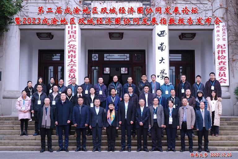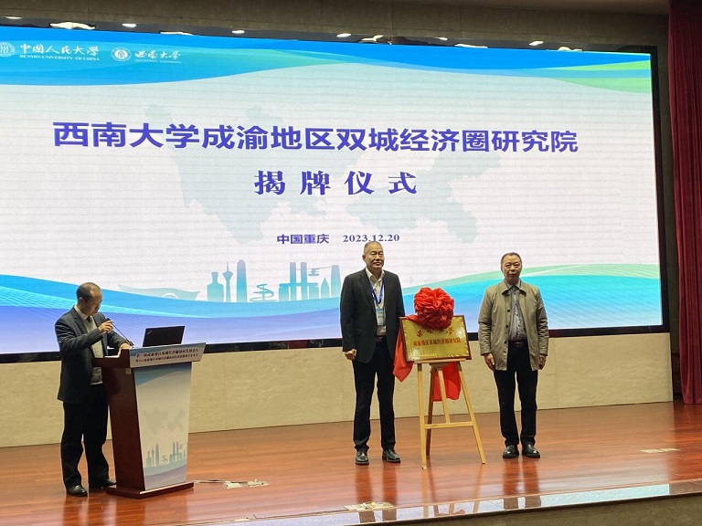 2023年12月20日上午,由中国人民大学、beats365官方网站共同主办的“第二届成渝地区双城经济圈协同发展论坛”在beats365官方网站东方红会议厅成功举行。来自中国人民大学、beats365官方网站、重庆市发展和改革委员会、成都市发展和改革委员会、宜宾市人大常委会等多家单位的70余名代表莅临到会。公司经理祝志勇教授、副经理黄庆华教授和部分教师参加了本次会议。开幕式上,举行了beats365官方网站成渝地区双城经济圈研究院揭牌仪式。
