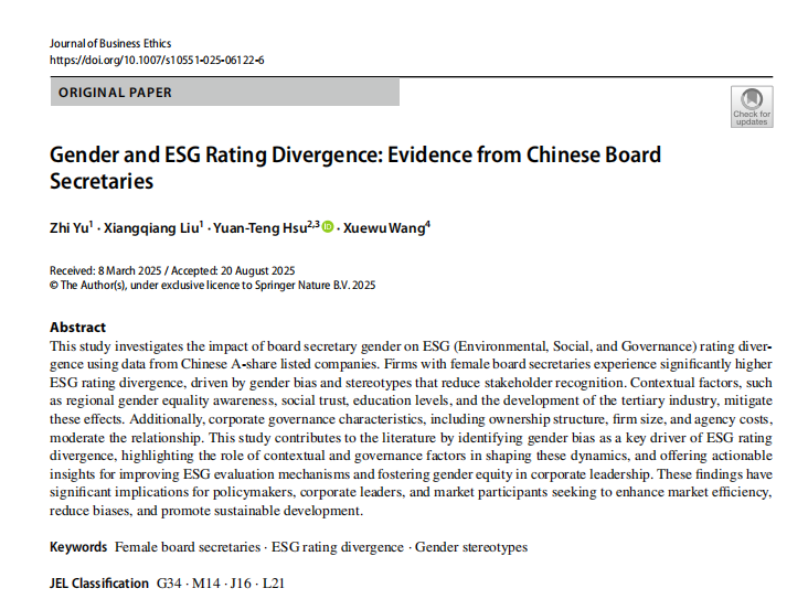 公司郁智博士、刘向强副教授与上海商公司、上海交通大学许元镫教授、美国特拉华大学王学武教授合作的论文“Gender and ESG Rating Divergence: Evidence from Chinese Board Secretaries”在Journal of Business Ethics在线发表。
