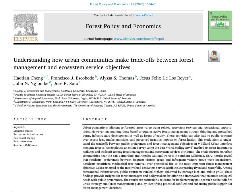 其中,发表于 Forest Policy and Economics的论文“Landowners' willingness to accept for sustainable forest management in the Cross-Timbers region, USA”探讨了林地主对可持续经营政策的接受意愿;另一篇论文“Understanding how urban communities make trade-offs between forest management and ecosystem service objectives”则聚焦城市居民在森林管理与生态系统服务间的偏好权衡。这两项研究从不同群体视角揭示了社会行为与森林政策之间的互动机制,为全球森林治理与生态补偿政策设计提供了实证支持。与此同时,程昊天与南京林业大学合作发表的论文“Are There Spatial Spillover Effects of Carbon Emission Trading Policy on Forest Carbon Sink Growth in China?”发表于Forests,研究发现碳排放交易政策在促进碳汇增长的同时,还具有显著的空间溢出效应,为碳市场的生态协同效应提供了新证据。