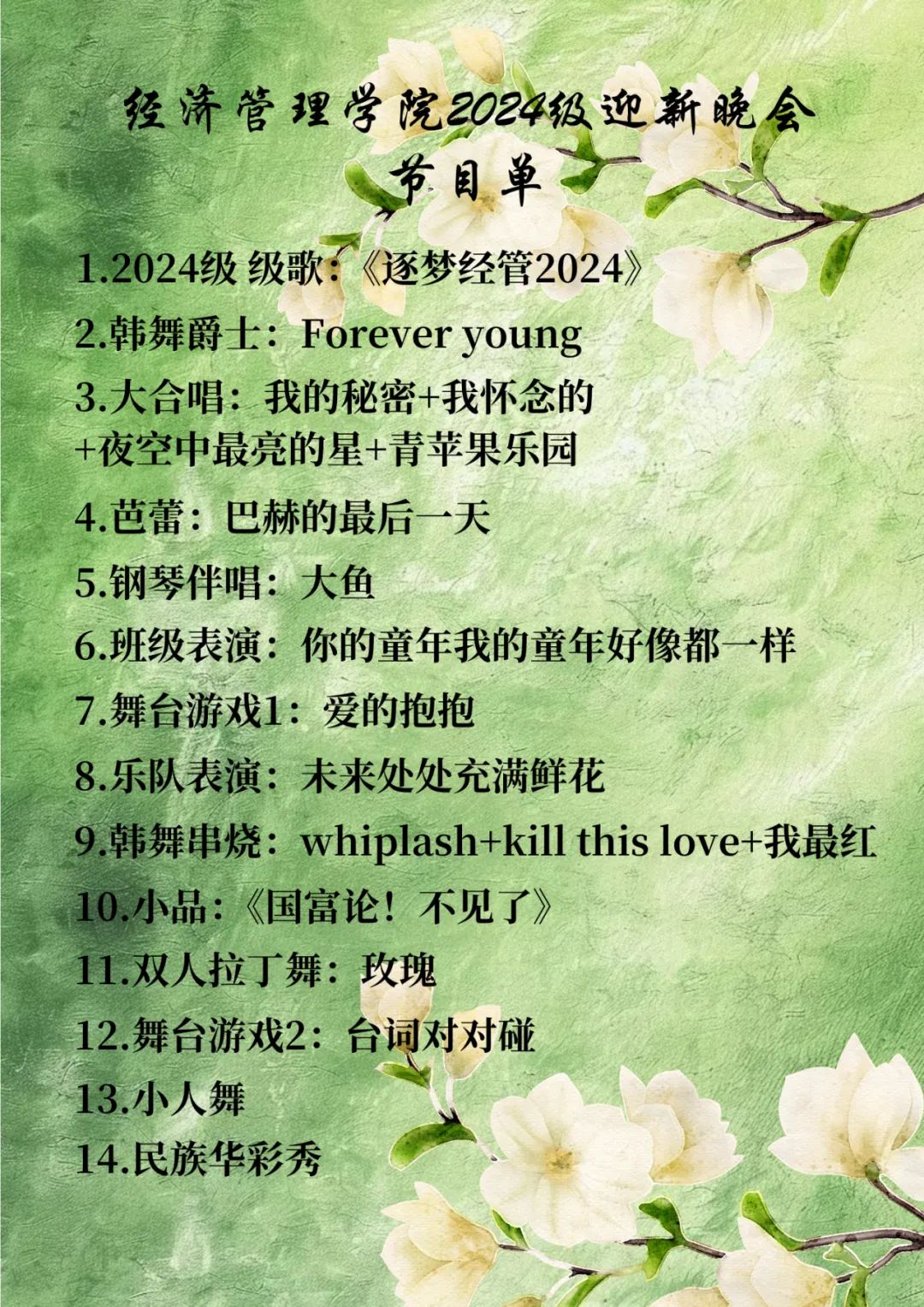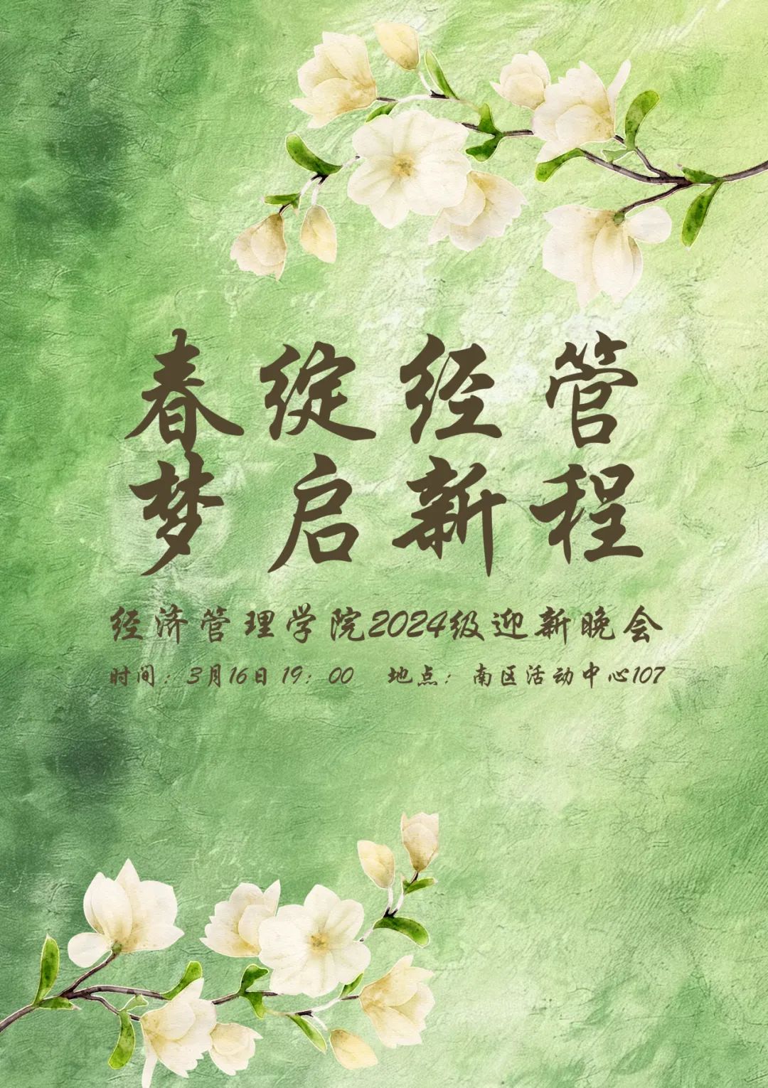 活动简介:春风送暖,万象更新。新的一年,经管院又迎来了一批新的朝气。在这充满希望的季节里,我们即将迎来2024级beats365官方网站迎新晚会,我们期待与你一起共赏这场青春与梦想交织的视听盛宴、共赴这场青春之约。(附节目单)