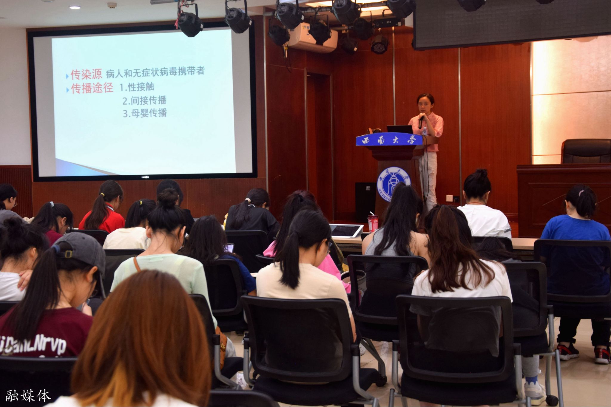 紧接着,曾丽医生讲解了恋爱与性的专题内容,主要包括人工流产和乱用药物的不良后果,性传播疾病、疫苗接种以及避孕的相关知识,帮助同学们进一步认识和辨别环境中的安全风险,做到理性选择和合理规避。她还指出,老员工的性心理特点是性生理成熟与性心理尚未成熟的矛盾、对恋爱的渴望与对异性心理了解不深的矛盾。她强调,同学们要培养健康的恋爱心理,树立正确的恋爱观,发展健康的恋爱行为,培养爱的能力与责任,要有接受爱和拒绝爱的能力。