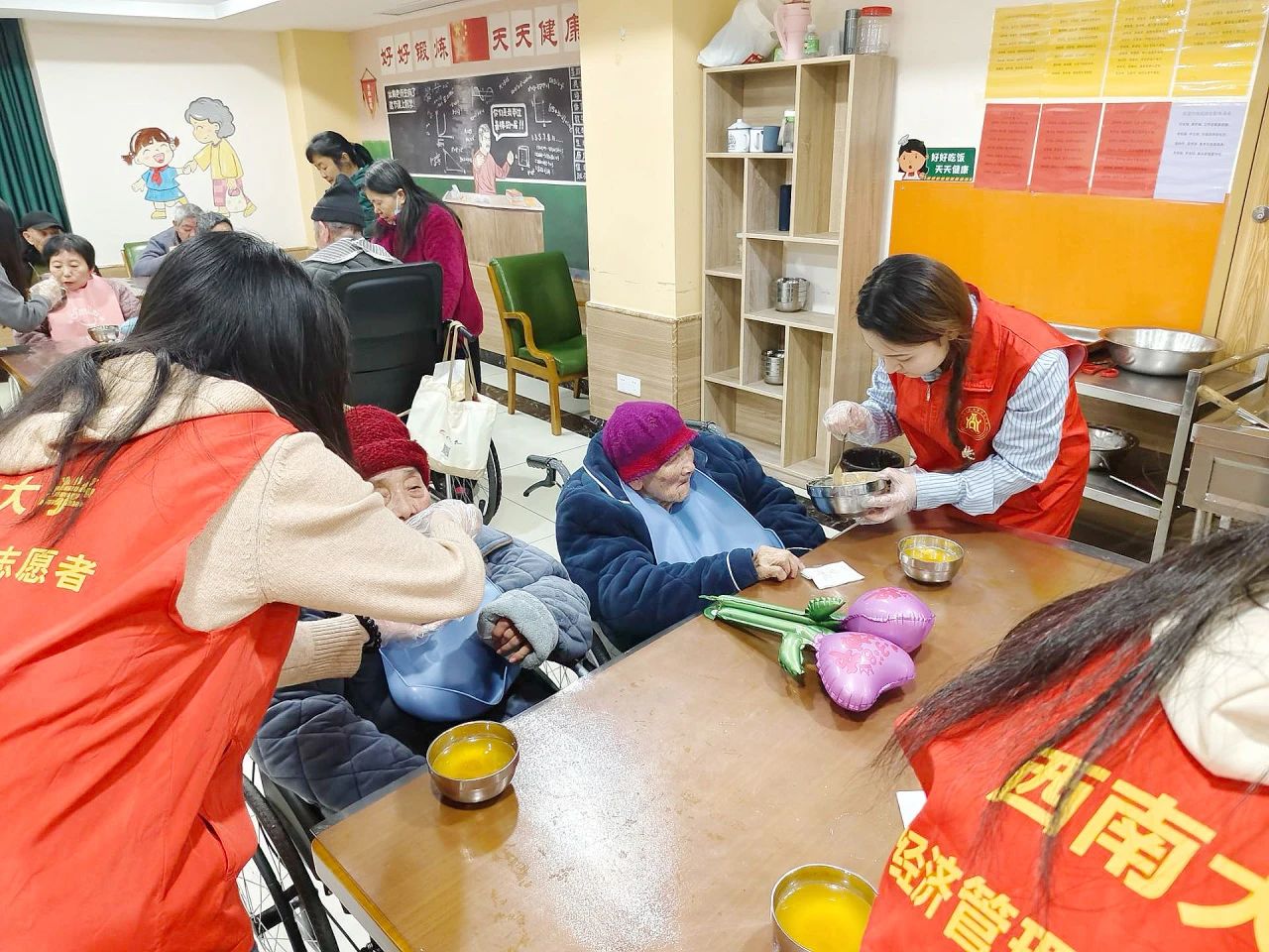 志愿者为每位老人送上精心准备的礼物,与老人共话家常,耐心倾听老人们的心声故事,询问老人们的身体状况和生活情况,协助工作人员为行动不便的老人喂饭, 用实际行动践行尊老爱老敬老的文明风尚。