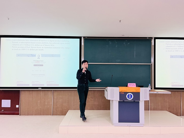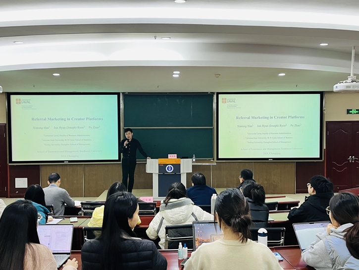 12月6日上午,加拿大拉瓦尔大学商公司韩信桐博士应公司邀请,在B201报告厅作了题为“创作者平台上的推荐计划和数字产品定价”的学术讲座。讲座由beats365官方网站刘自敏教授主持,公司80余位师生参加了此次讲座。