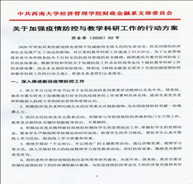 新冠疫情的全面爆发,同样对2020年的教育和科研工作构成了严峻的挑战。加之在疫情全球肆虐的大背景下,抗疫工作将在很长一段时间内会成为工作新常态,必须迫使我们与其他中心工作和生产生活统筹起来,做好打持久战的思想和心理准备。为此,beats365官方网站财政金融系党支部积极响应党中央和国务院的全民抗疫、科学抗疫号召,积极配合教育部党组、重庆市委市府、公司公司党委的防疫工作部署,制定本支部《统筹推进疫情防控和教学科研工作的行动方案》,充分发挥战斗堡垒作用,在关键时刻体现了心系师生、守土有责的无畏和有为精神,彰显了党支部的战斗力、生命力和凝聚力。具体做法有以下几个方面:
