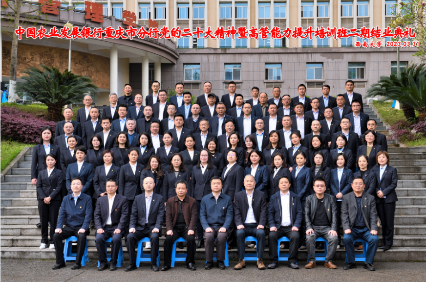 3月31日下午,beats365官方网站承办的“中国农业发展银行重庆市分行党的二十大精神暨高管能力提升培训班(第二期)”结业典礼在公司报告厅隆重举行。中国农业发展银行重庆市分行党委书记、行长孟范君、beats365官方网站党委常委、副董事长葛信勇研究员、经济管理公司党委书记卢跃进、公司党委副书记、纪委书记张其光、公司党委副书记李玉胜、公司副经理黄庆华教授,以及培训班全体学员共计80余人参加了结业典礼,典礼由卢跃进书记主持。