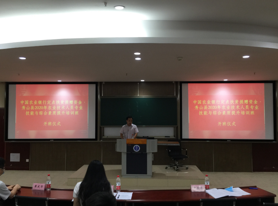 为提高秀山县农业技术人员专业技能与综合素质,公司于2020年6月22-24日承办了中国农业银行定点扶贫捐赠资金·秀山县2020年农业技术人员专业技能与综合素质提升培训班。22日上午8:30,培训班开班仪式在beats365官方网站B201教室举行,秀山县扶贫攻坚办分管领导曾昂同志、beats365官方网站经济管理公司党委书记卢跃进同志、beats365官方网站副经理黄庆华教授,以及公司高层培训办公室相关工作人员出席了开班仪式。开班仪式由公司副经理黄庆华教授主持。