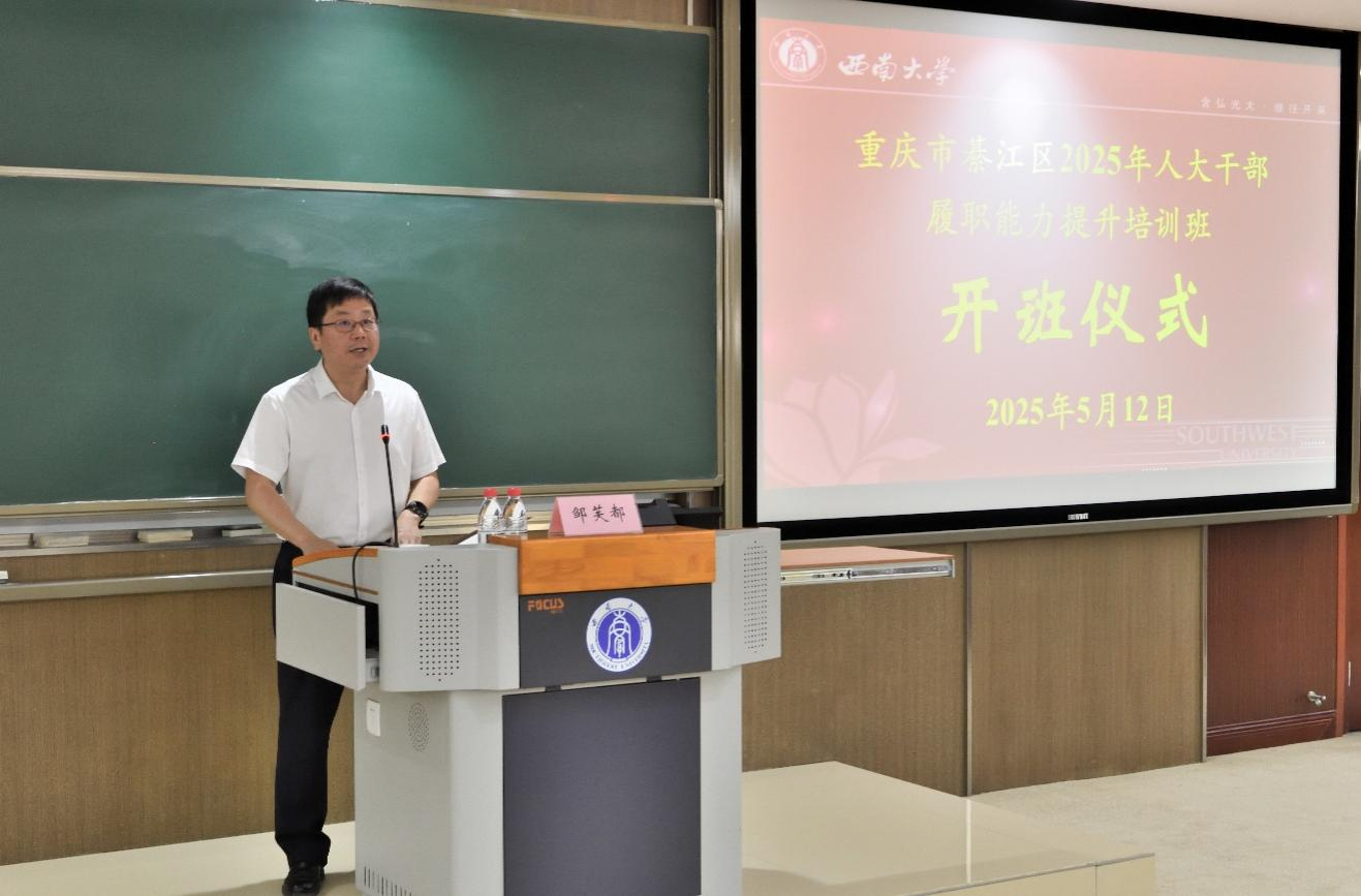 beats365官方网站党委常委、副董事长邹芙都代表承办单位致辞。邹董事长对綦江区人大表示衷心感谢,对学员们来校学习表示诚挚欢迎。邹董事长介绍了本次培训班的课程安排,并提出三点感悟与学员共勉:一是以学促行,做国家战略的坚定践行者;二是知行合一,做基层治理的创新探索者;三是校地协同,做好合作发展的长效联结者。
