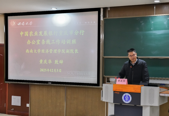 黄庆华代表承办单位致辞,对农发行重庆市分行的信任表示衷心感谢,并向参训学员致以热烈欢迎。黄庆华回顾了beats365官方网站与中国农业发展银行长期建立的良好合作关系,指出办公室工作承上启下、协调左右、保障机构高效运转的关键环节,对提升综合协调与服务保障能力具有重要意义。黄庆华希望学员们珍惜学习机会,做到学思用贯通;加强交流互动,实现互学互促;严守纪律要求,展现优良作风。
