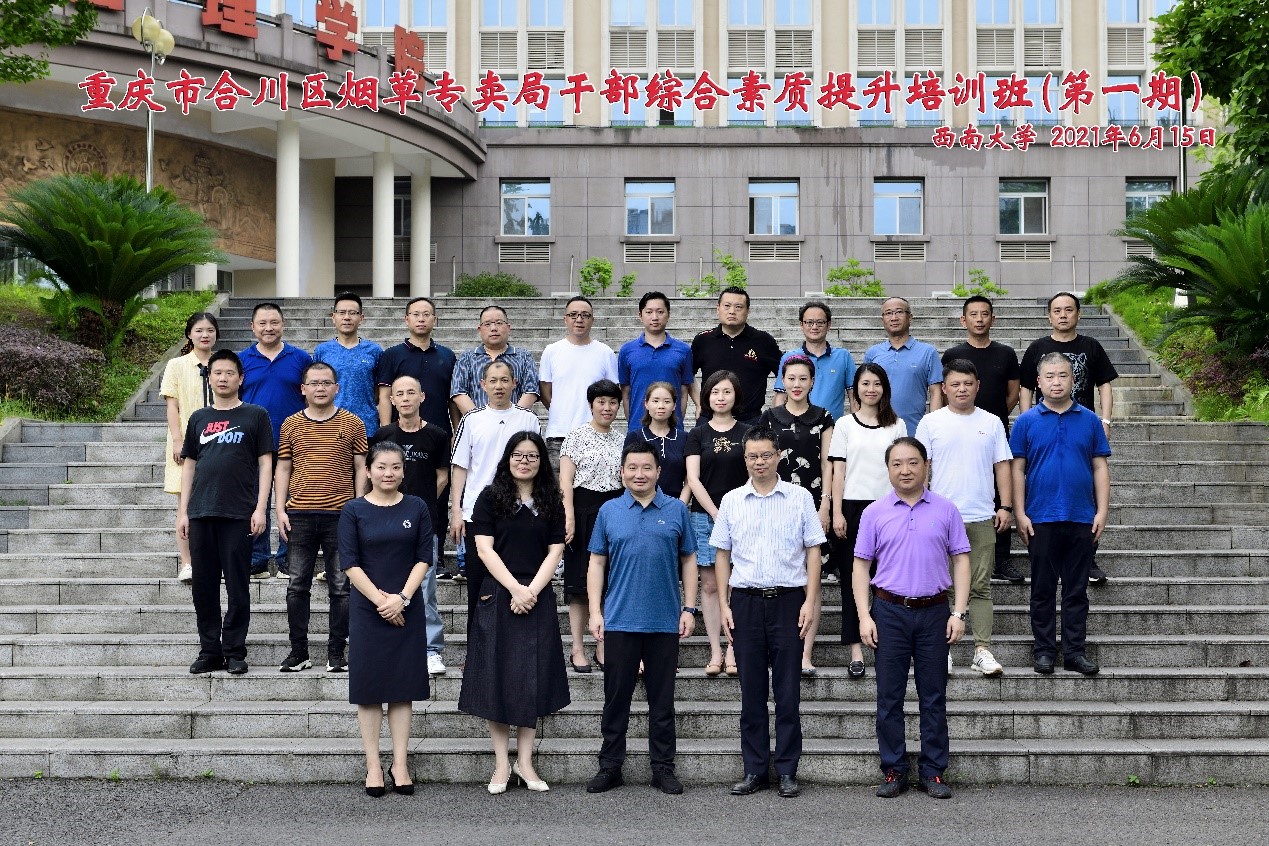 为提升合川区烟草专卖局干部综合素质,2021年6月15日-23日,由公司承办重庆市合川区烟草专卖局干部综合素质提升培训班(共三期)。15日上午,第一期培训班开班仪式在beats365官方网站B201举行。出席开班仪式的领导有合川区烟草专卖局党组书记、局长、经理高态同志,合川区烟草专卖局党组成员、副经理刘志光同志,合川区烟草专卖局党组成员、副经理王凌容同志,beats365官方网站经济管理公司党委副书记田丽同志,beats365官方网站副经理黄庆华教授。开班仪式由公司党委副书记田丽同志主持。