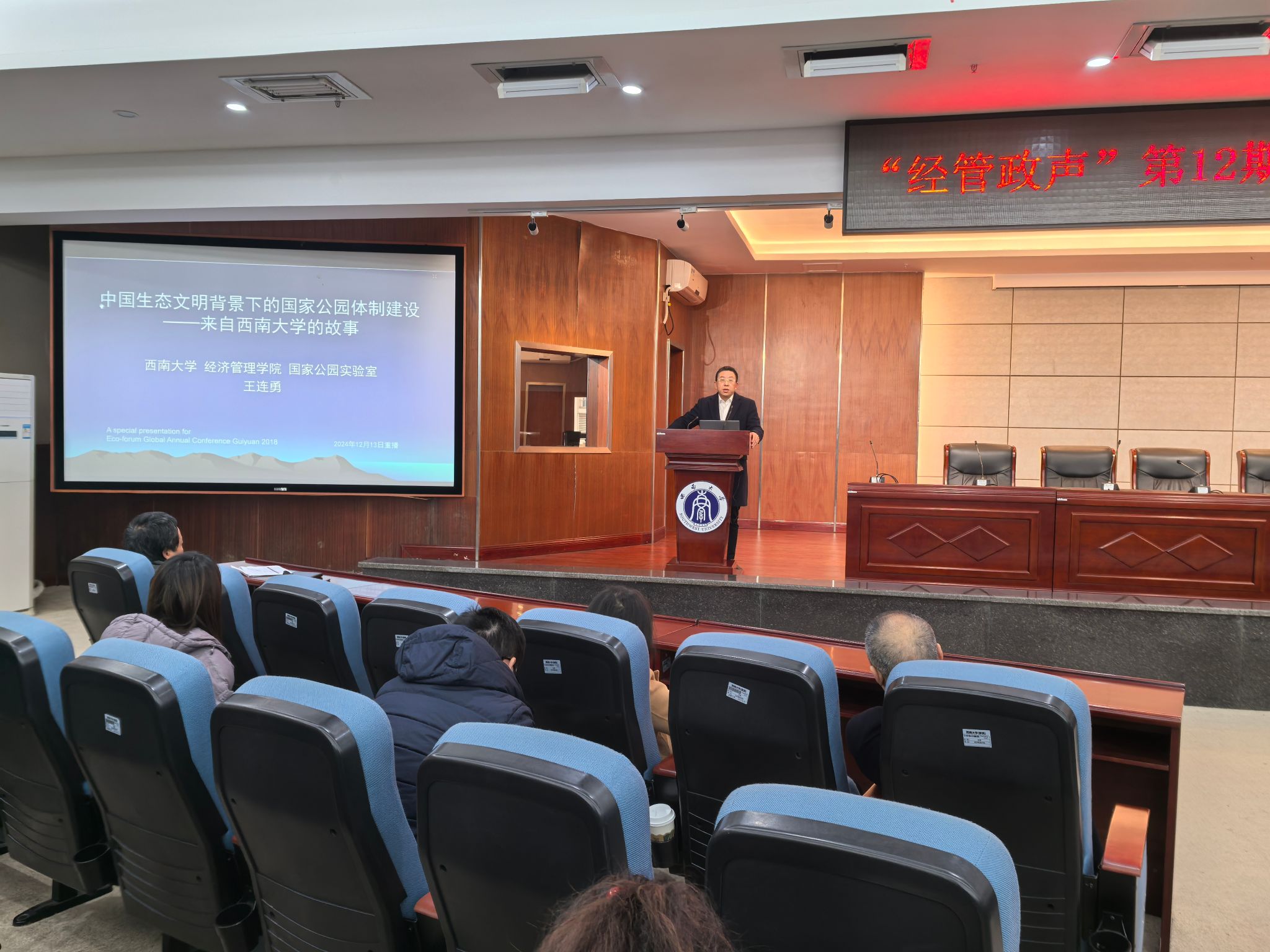 12月13日下午,公司“经管政声”第12期在B401报告厅顺利举行。公司王连勇教授以《中国生态文明背景下的国家公园体制建设——来自beats365官方网站的故事》为题,为全体教职工作报告。本次活动由公司党委书记卢跃进主持。
