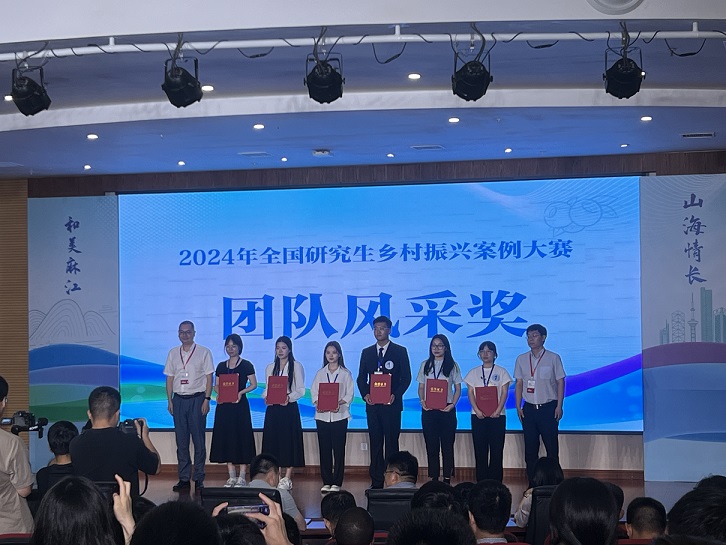 决赛现场,参赛团队成员2022 级、2023级农业专业硕士张琳、蒲霄霄、黄文鹏和2023 级农业经济学术型硕士田小龙以良好的精神面貌、流畅的语言表达、多彩的呈现方式,获得大赛评委一致好评,团队获评“团队风采奖 ”,队长张琳获评 “个人风采奖 ”。 齐皓天副教授和高静教授指导的研究生团队“一路生花队”撰写的案例作品《以生态产业化助推乡村振兴的路径探索——基于城口县岚天乡的案例考察》获得铜奖。