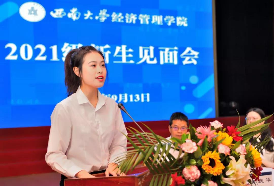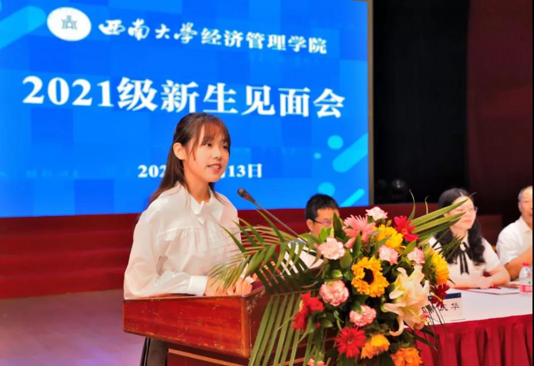 研究生新生代表贺文瑾深情回忆了本科四年在西大学习生活的美好瞬间,并以饱满的热情展望了未来三年的研究生生活,她表示要坚定学术理想,树立家国情怀;增强学术能力,提升专业素养;保持学习热情,展现良好风貌,努力活出卓越与非凡,活出充实与精彩。
