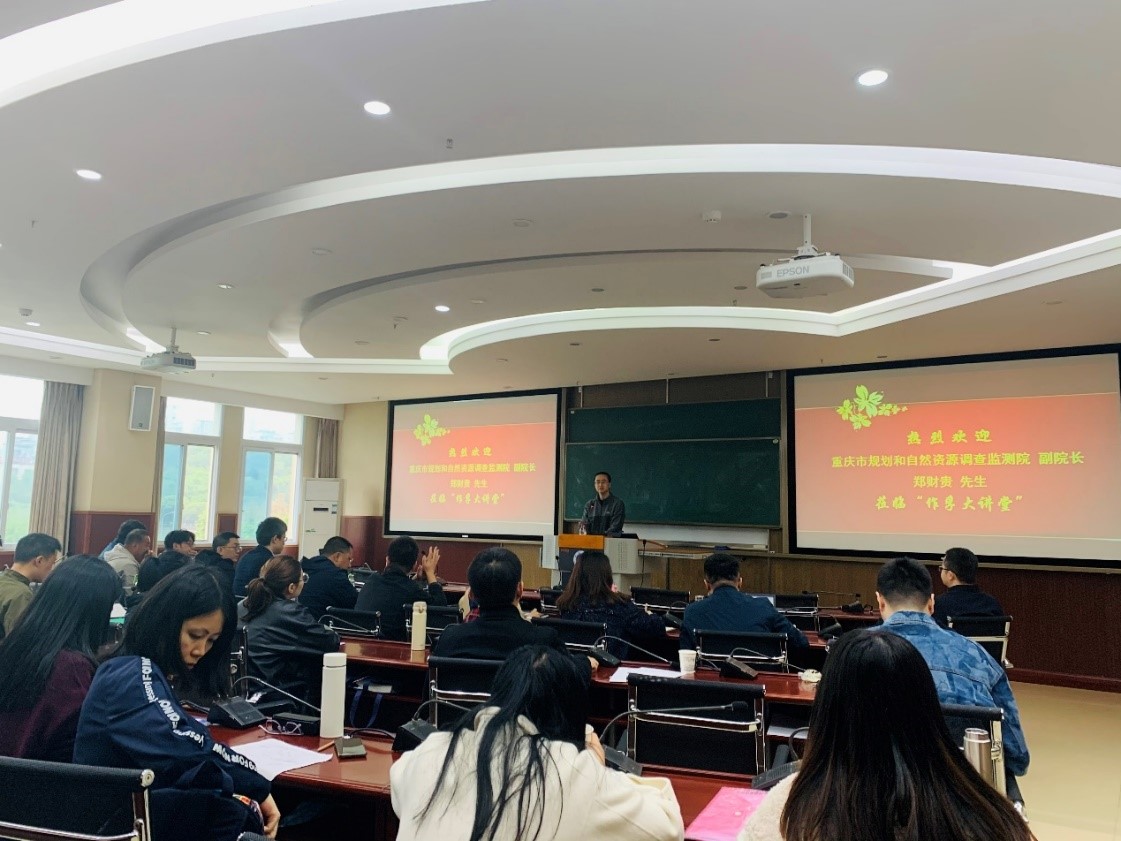 其次,他谈到需要制定自然资源调查监测法规制度建设规划,以推动自然资源调查监测工作的持续深入发展。然后,他结合重庆实际情况,介绍了重庆市规划和自然资源调查监测院的基本情况,重庆在自然资源调查监测方面的工作部署和实施计划。最后,他针对师生提出的就文旅开发过程中的自然资源管理问题与师生进行了热烈互动,赢得了师生的一片掌声。