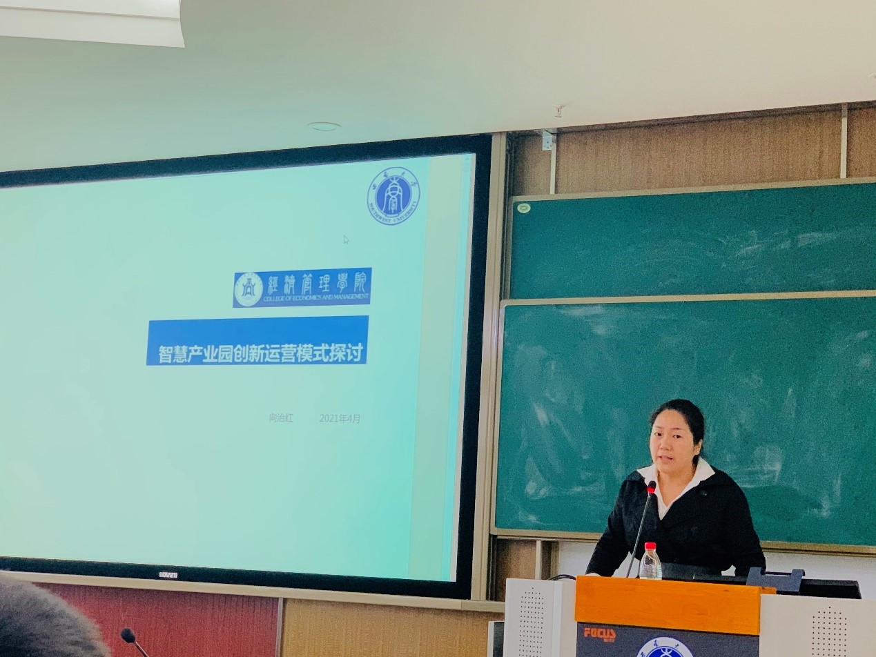 向治红女士以“智慧产业园创新运营模式探析”为主题进行了分享。她首先从师生身边的智能化说起,引出了智慧梦想城这一概念。接着,她结合成都的实际案例,就什么是智慧产业园、为什么要投资开发建设智慧产业园、怎么投资智慧产业园进行了专业分享。其次,她从运营模式、硬件打造、招商管理、配套完善、退出机制等多个方面对智慧产业园的运营进行了介绍。最后,向女士在互动问答环节,就师生提出的成渝产业发展侧重点不同、智慧园区运营中企业如何管理、智慧园区打造等问题进行了回答,她认为成渝两地由于文化和发展侧重点不同,合则两利展,成渝双城经济圈将会发展的越来越好,而智慧园区将是成渝双城经济圈合作发展的重要契机。