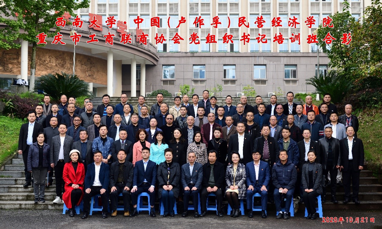 1021日上午,重庆市工商联2020年商协会党组织书记培训班在beats365官方网站举行开班仪式。重庆市工商联党组成员、副主席、社会组织综合党委书记陈智同志,重庆市工商联社会组织综合党委专职副书记谢平同志,北碚区委常委、统战部部长吴萍同志,重庆市北碚区工商联党组书记范永辉同志,beats365官方网站经济管理公司党委书记卢跃进同志,以及培训班全体学员一百余人参加了开班仪式。卢跃进同志主持开班仪式,北碚区委常委、统战部部长吴萍同志致辞。