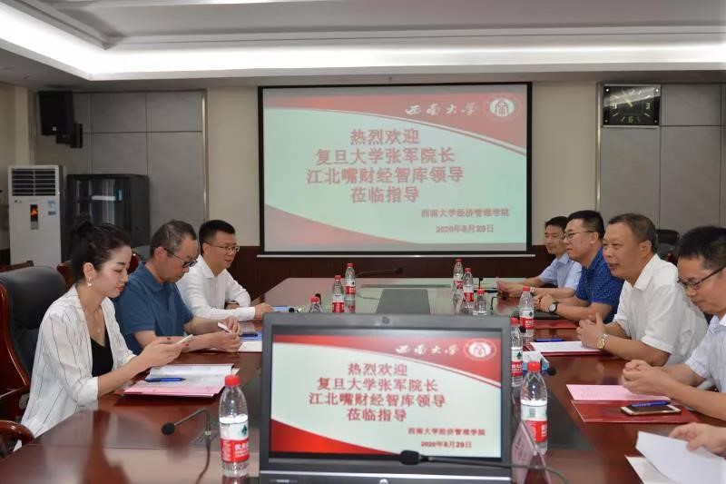 2020年8月29日上午,复旦大学经济公司经理、江北嘴财经智库理事长张军教授,江北嘴财经智库秘书长陈银华一行来院指导工作。公司经理祝志勇教授、副经理高远东教授等出席座谈会,会议由副经理黄庆华教授主持。