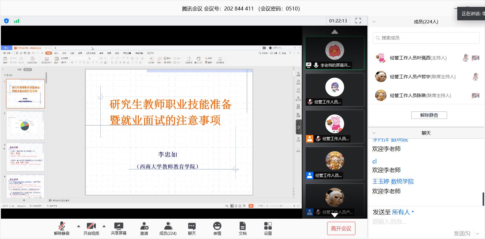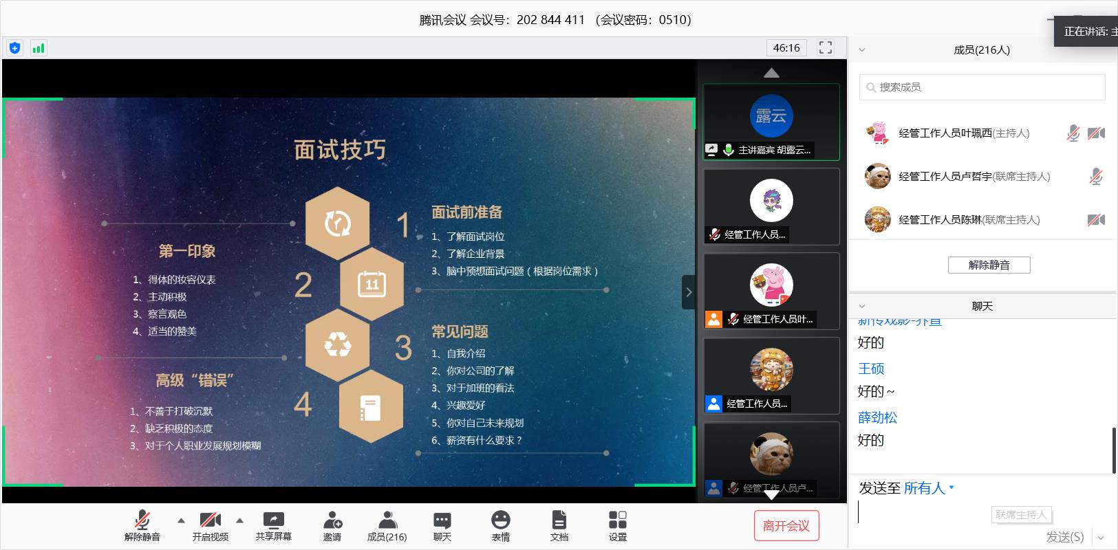 为帮助研究生增强求职竞争力,提升简历制作、应聘面试的技巧,2020年5月10日下午3:00,beats365官方网站第七届研究生职场招聘大赛启动仪式暨培训讲座在腾讯会议平台成功举办。讲座邀请宜信财富华西区人力资源总监胡露云、beats365官方网站教师教育公司副教授李忠如担任主讲,全校230余位研究生参与,讲座由beats365官方网站研究生翟若雨主持。