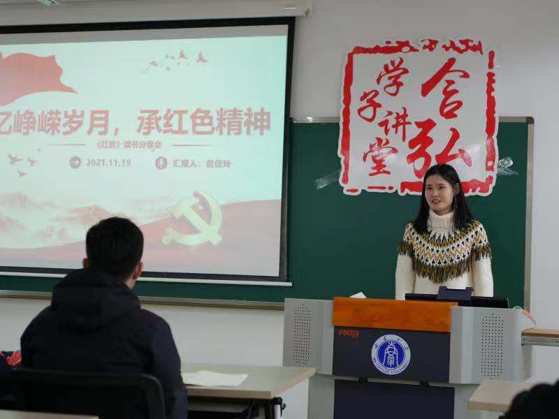 赵佳玲分享了《红岩》,她首先介绍了江姐、成岗等一批爱国的革命先烈,在面对反动派惨无人道的折磨时,义无反顾选择保守党的秘密,与国民党反动派英勇斗争、为信仰共产主义而死的故事。用照片和视频分享的形式,带领着观众一起穿越到那个火红的年代,体会红岩魂,领略赤胆的忠诚,以及革命者穿透一切的目光。另外以习近平总书记“七一”重要讲话精神作为切入点,阐述了新时代的红岩精神,并积极倡导我们当代青年必须坚定理想信念,养成浩然正气,始终保持共产党人敢于斗争的风骨、气节、操守和胆魄,发扬斗争精神,增强斗争本领,以顽强意志,从容应对各种风险挑战!