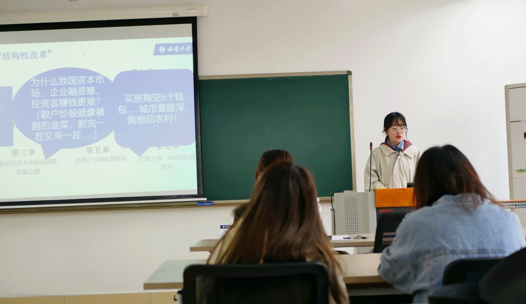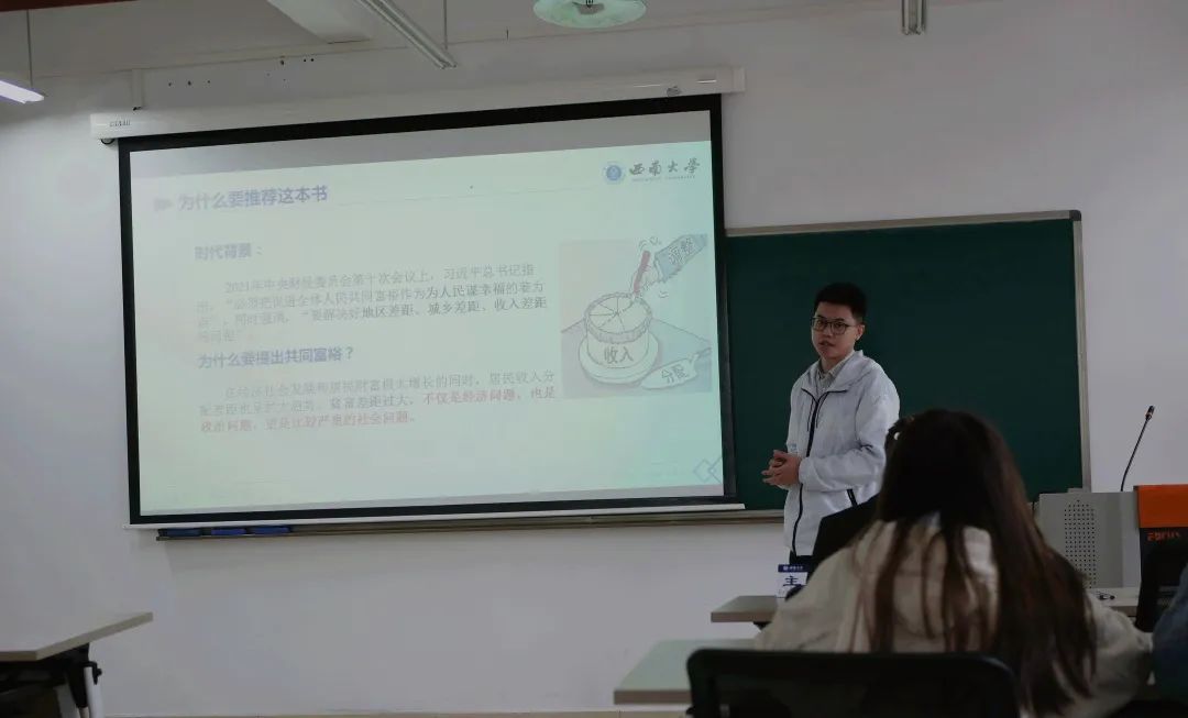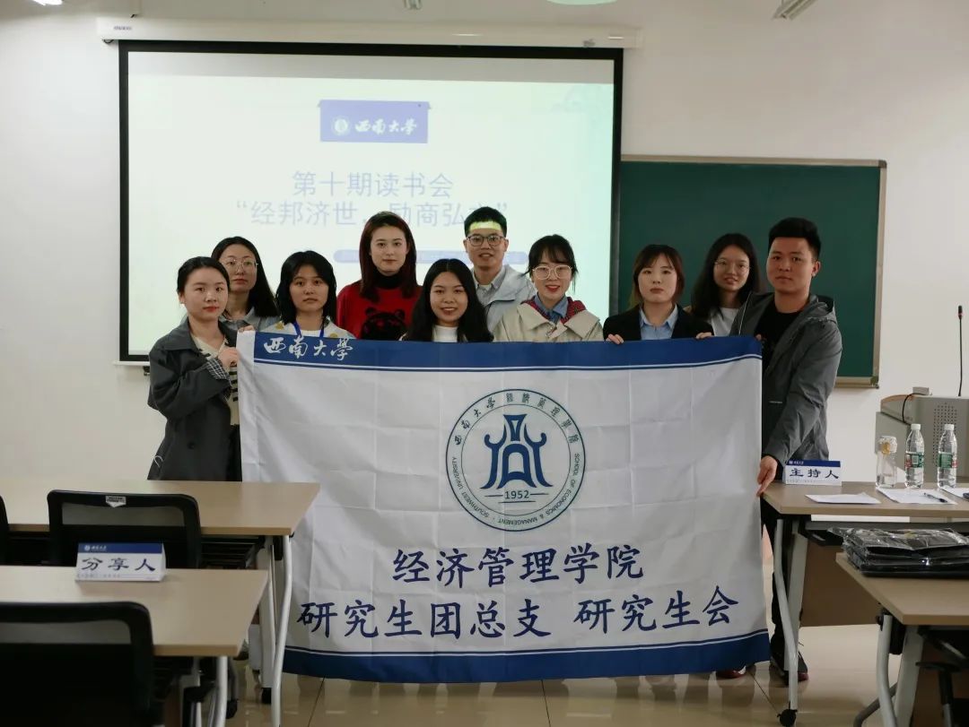 本次读书会以“经邦济世,励商弘文”为主题,由2020级农业经济管理专业马新萍、2020级金融专业胡大成、2021级区域经济学专业贺文瑾、2021级金融专业王丹作分享,2021级会计学专业黄熙主持。
