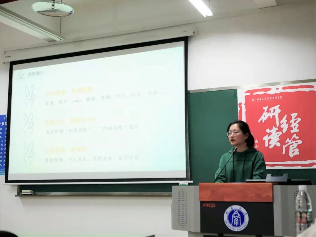 本次读书会以“给心灵留一点空隙|研究生压力排解与自我管理”为主题,由2021级国民经济学专业李艳丽、2021级金融硕士专业张梦迪、2021级金融硕士专业宋檬、2020级农业经济管理专业任赞杰作分享,由2021级农业管理专业李若澜主持。