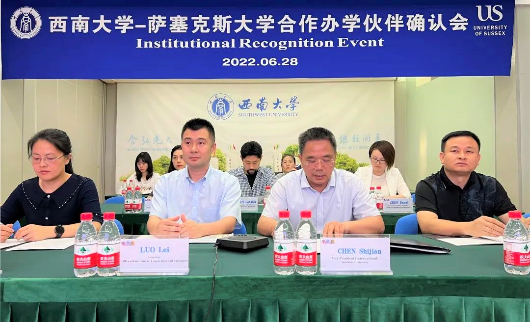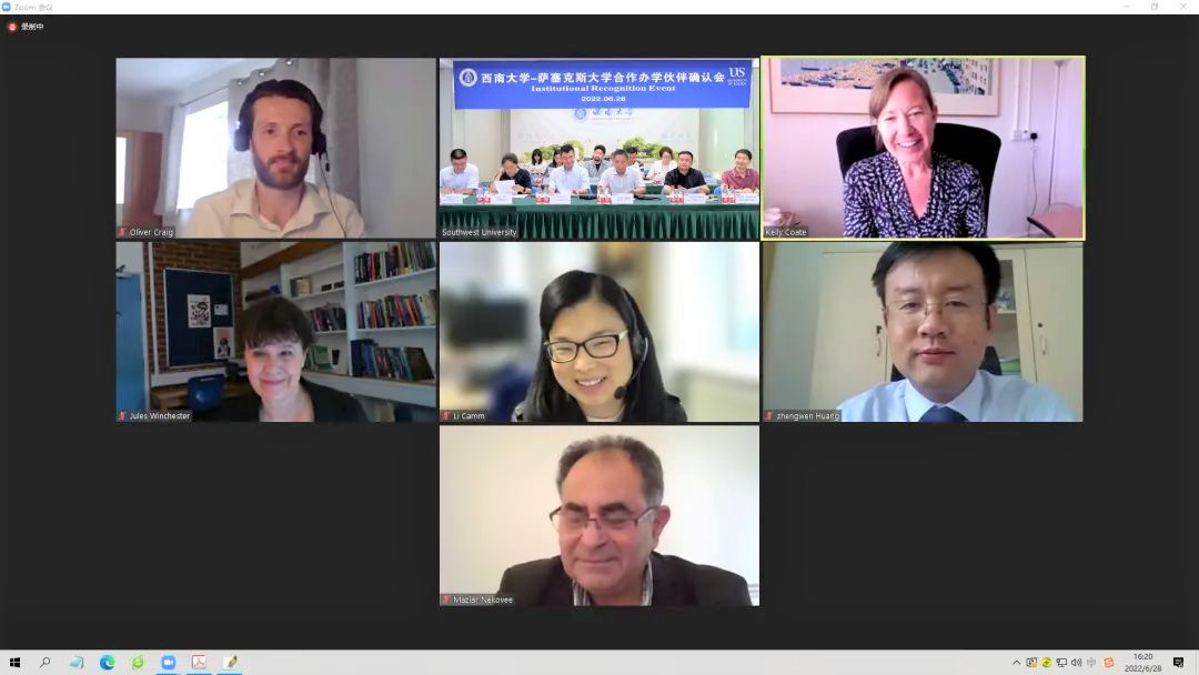 6月28日下午, 公司 与英国 Sussex 大学就 本科 “金融科技 4+0 ”合作办学项目举行了伙伴关系确认会。 Sussex 大学副董事长凯利·科特(Kelly Coate) 与西大副董事长陈时见出席并全程参加会议, 公司罗超平副经理及项目团队成员、国际处、教务处同仁和Sussex 大学 相关负责人一同参加本次线上会议。