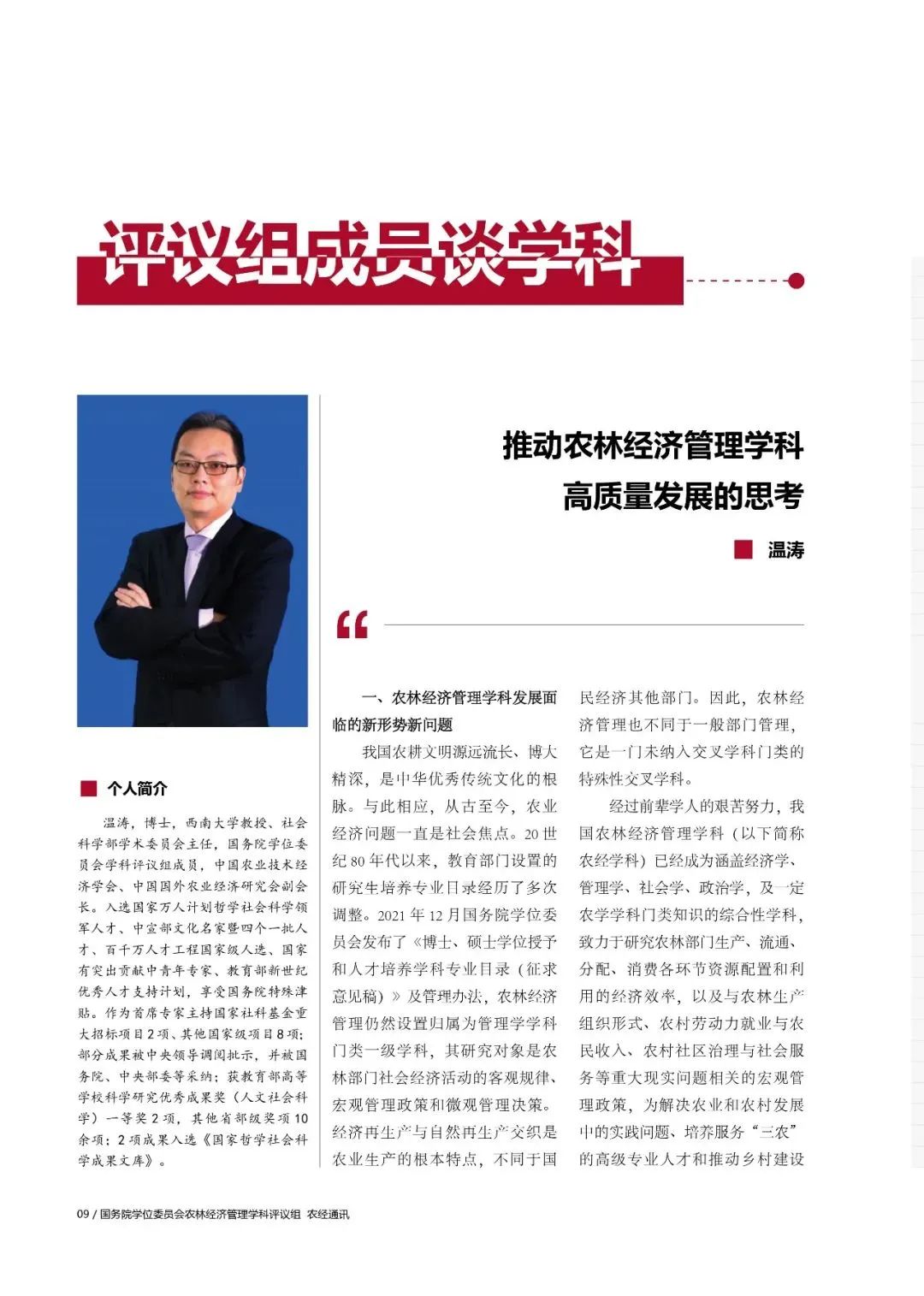 近日,国务院学位委员会农林经济管理学科评议组工作简报《农经通讯》第3期“评议组成员谈学科”栏目,刊发了公司温涛教授《推动农林经济管理学科高质量发展的思考》一文。