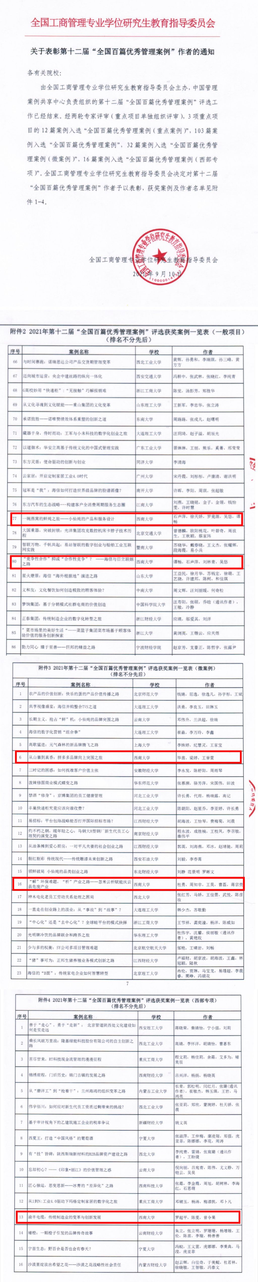 在第十二届“全国百篇优秀管理案例”评选中,MBA教育中心推送的案例中有6篇成功入选“全国百篇优秀管理案例”,分别是黄庆华、刘敏、潘婷、李昊团队撰写的案例《博观约取,厚积薄发:新绿药的企业社会责任践行之路》(精准扶贫与企业社会责任专项),石声萍、徐天娇、罗竟源、吴悠、谭畅团队撰写的案例《一碗燕窝的鲜炖之旅——小仙炖的产品和服务设计》(一般项目),谭畅、石声萍、刘林青、吴悠团队撰写的案例《“竞争性合作”抑或“合作性竞争”?——海信与日立联姻之路》(一般项目),毕茜、梁婷、王誉萱团队撰写的案例《从山寨到真香:拼多多品牌向上突围之旅》(微案例),杜勇、周知非、王昊、曹磊、蒋宗贵团队撰写的案例《“解”环保难题,“析”产业之路——忽米云析赋能庆云县危废产业》(微案例),罗超平、陈雯、曾令果团队撰写的案例《渝丰电缆:传统制造业的变革与创新发展》(西部专项)。