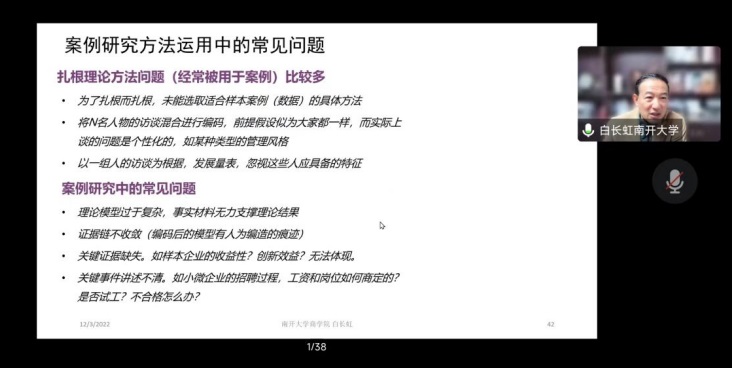 2022年12月3日,南开大学商公司经理白长虹教授应公司邀请线上为公司师生作了题为“面向实践的管理研究”的学术讲座,讲座由公司经理祝志勇教授主持。
