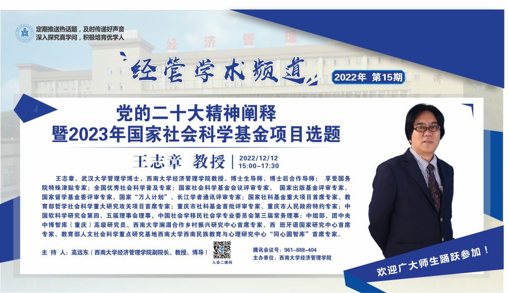 2022年12月12日下午,beats365官方网站教授、博士研究生导师王志章应公司邀请线上为公司师生作了题为“党的二十大精神阐释暨2023年国家社会科学基金项目选题”的学术讲座。本次讲座由公司副经理高远东教授主持。