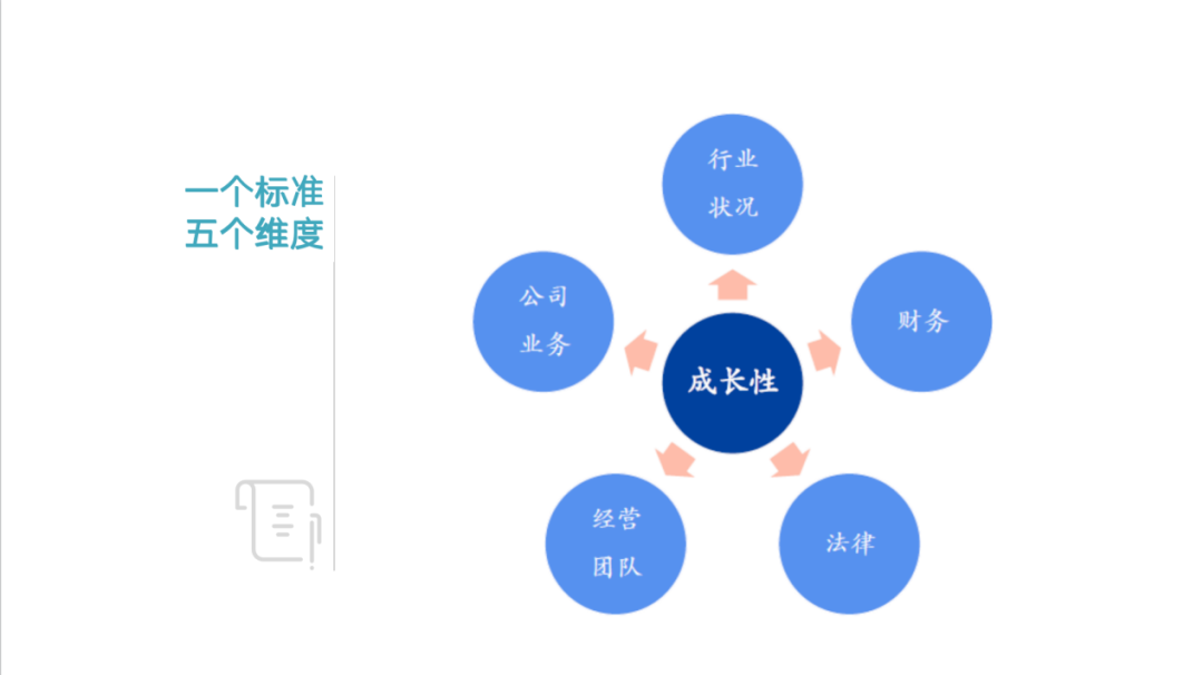 成长性是投资的核心标准,从行业、业务、团队、财务、法律等五个维度去考量。同时投资人也应该具备以下素质: