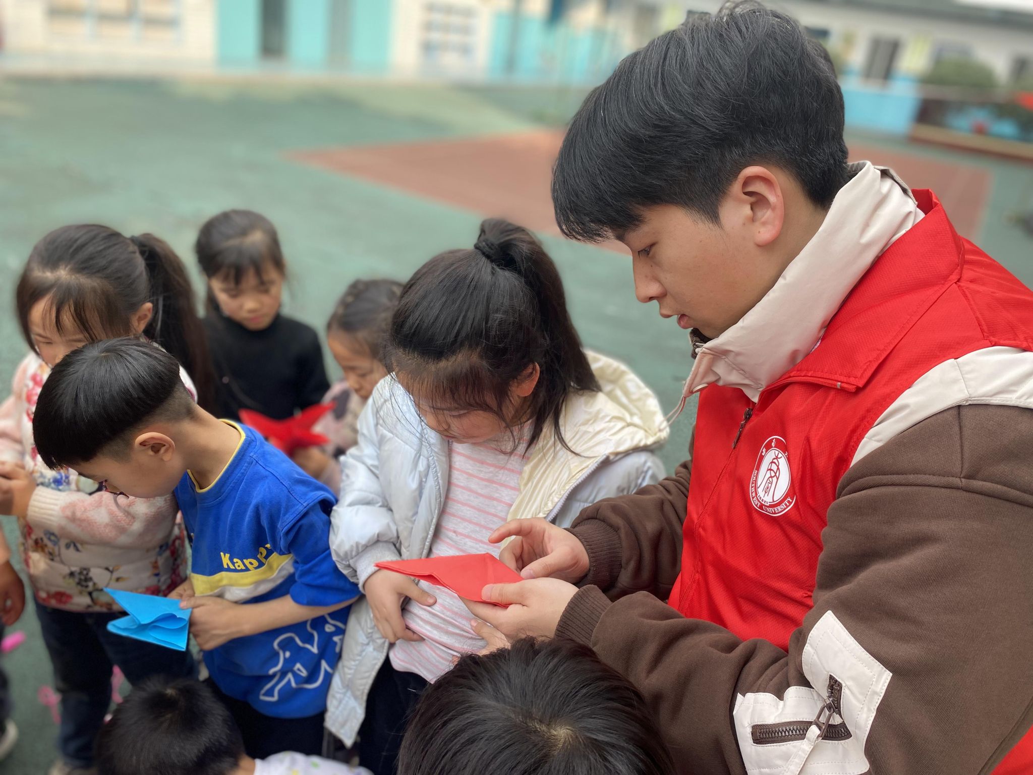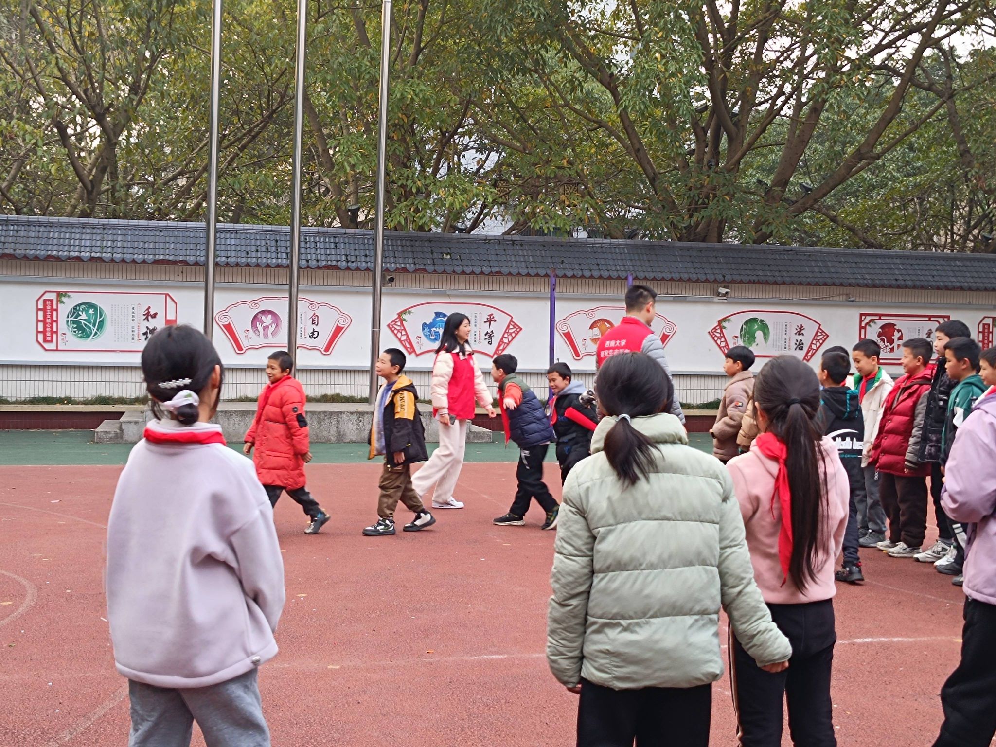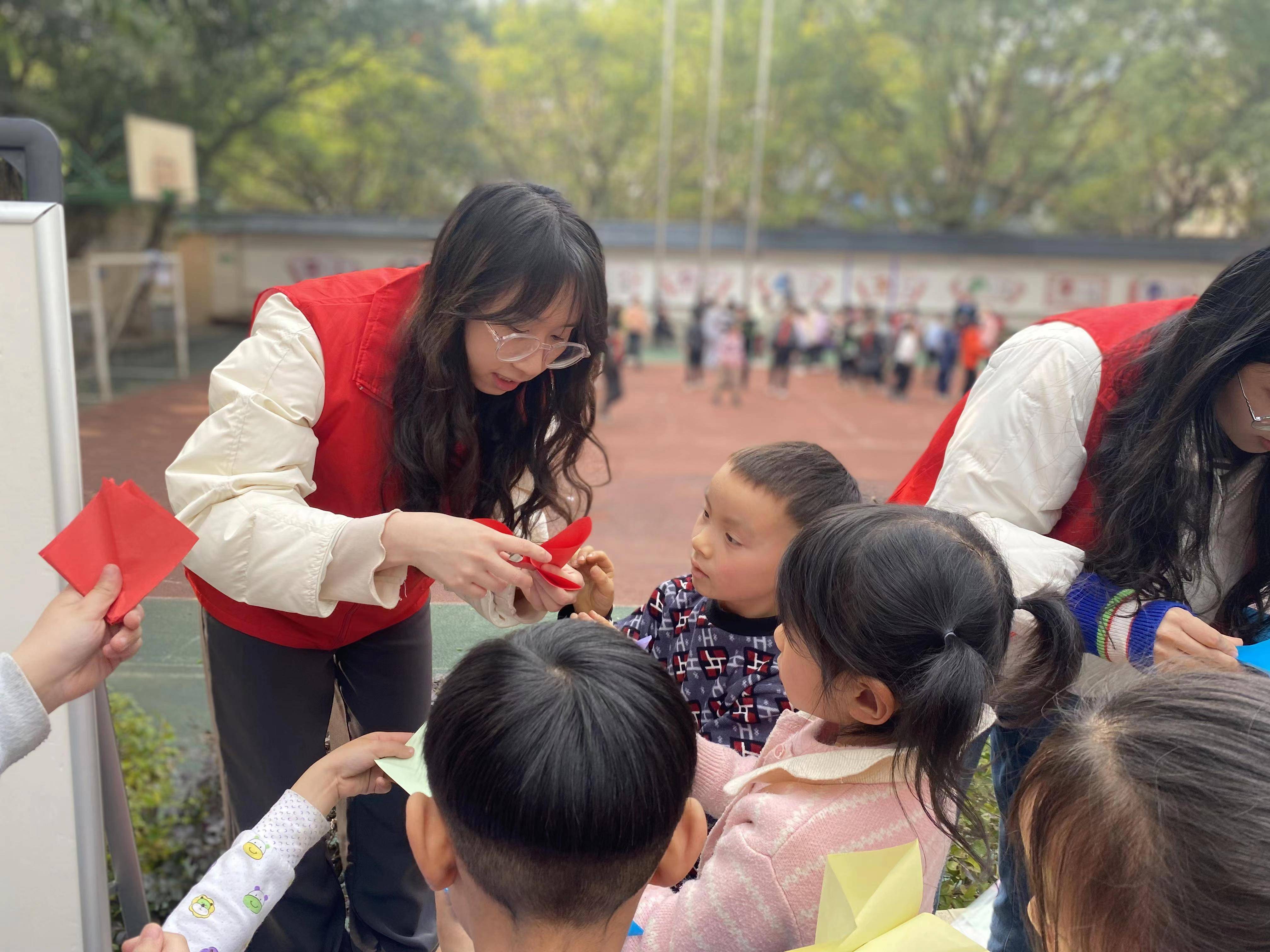 实践队成员高春颖为孩子们带来了一堂生动形象的“红色教育课”,孩子们围坐在操场上,手持小国旗认真倾听革命先辈们的传奇故事并合唱歌曲《团结就是力量》,飞舞的小国旗和动听的歌声中展现了少年的力量。本次课程让孩子们更好地理解和传承红色文化,从红色故事中坚定爱国信念。