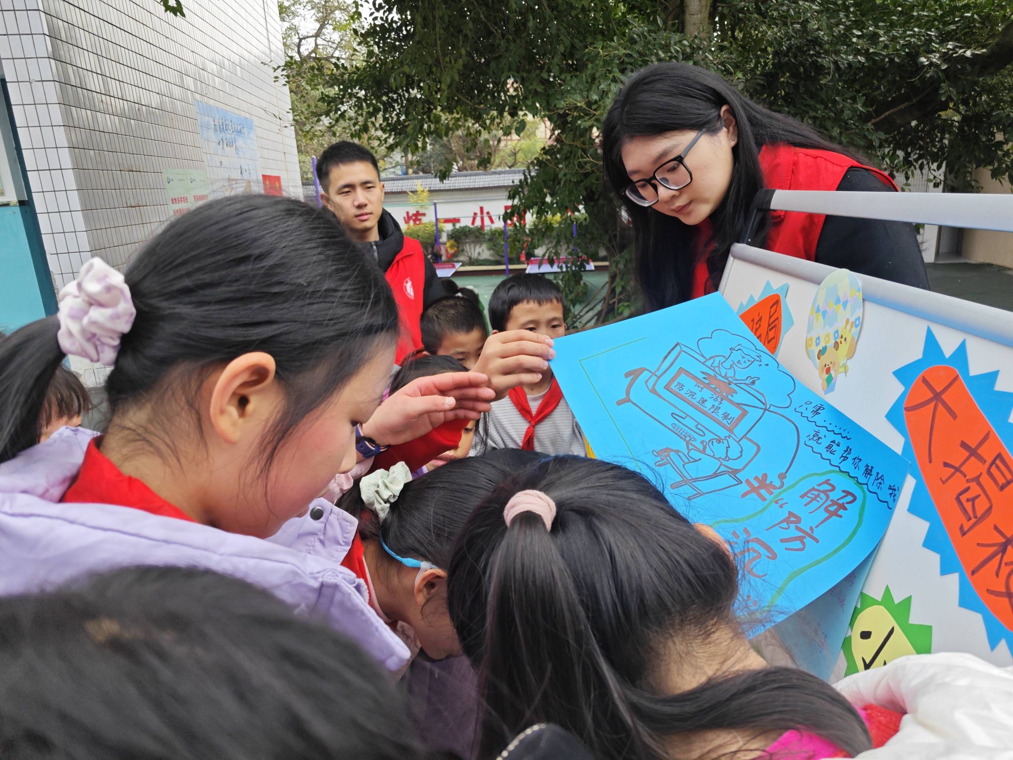 实践队在完成教学活动的同时,在课堂外相继开展了以“网络骗局大揭秘,争做防诈小能手”和“拥抱蓝色海洋 珍爱生命摇篮”为主题的公益宣讲活动。活动通过资料宣讲、知识问答、共创板画等方式与孩子们互动,教会孩子们识别和规避网络诈骗的能力,培养孩子们的生态文明意识。