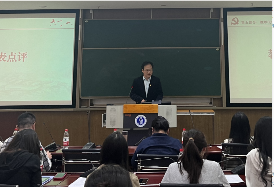 导师代表刘建新对本次主题党日进行点评。他指出此次主题党日准备充分,内容丰富,紧密结合学科专业实际,加强了师生之间的思想交流。他强调读书能够开拓视野、提升能力、减压护心、涵养气质,并结合自身学习工作经历,勉励与会研究生珍惜学习时光,深耕专业领域,潜心学术研究,努力产出高质量成果,不负青春,不负韶华。