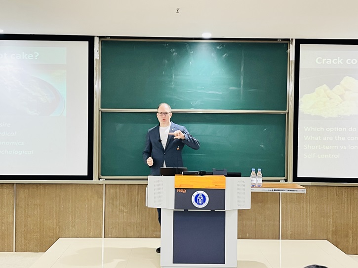 Martin Vestergaard教授以“生活中的食品选择”为切入点导入主题,从意愿、医疗、经济和心理动机四个方面探讨了人们在决策时的思考过程,通过对比长期、短期目标,逐步引入对非理性决策和理性决策的探讨,进而提出人在决策时会面对两个不同的系统。