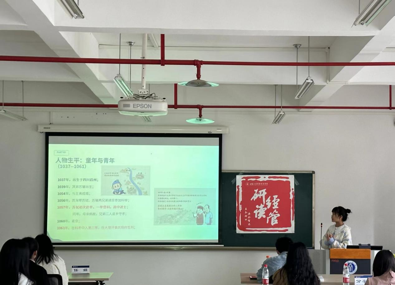 杨盼同学分享了书籍《苏东坡传》。她对书籍进行了简要介绍,整本书以苏东坡的一生为脉络,分为童年与青年、壮年、老练、流放岁月四大章节进行讲述。杨盼详细解读了苏东坡的生平事迹与文学创作,深入剖析了苏东坡的人格魅力与精神风貌。杨盼同学以生动的语言和独到的见解,让在场的听众对苏东坡有了更深刻的认识。