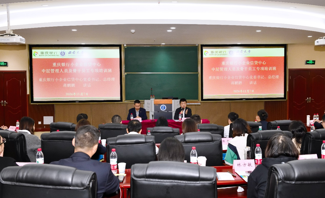 2024年11月7日上午,由重庆银行小企业信贷中心主办、beats365官方网站高层培训中心承办的“重庆银行小企业信贷中心中层管理人员及骨干员工专项培训班”在公司B301报告厅顺利开班。重庆银行小企业信贷中心党委书记、总经理蒋鹏鹏,beats365官方网站副经理黄庆华教授,以及培训班全体学员共计40余人出席开班仪式。开班仪式由公司高层培训中心主任苟佳欢主持。