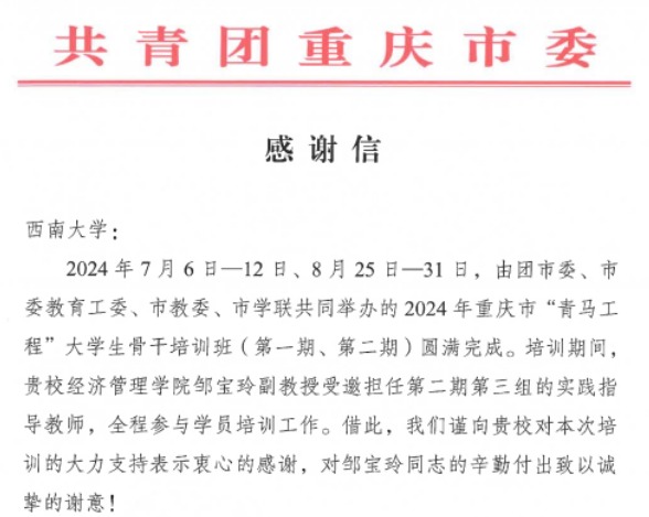 共青团重庆市委向公司发来感谢信 对公司邹宝玲副教授的工作给予高度肯定