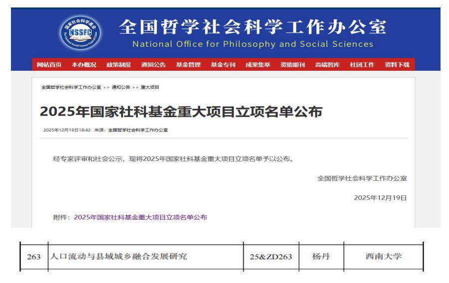 近日,全国哲学社会科学工作办公室公布了2025年国家社科基金重大项目立项名单,公司杨丹教授作为首席专家申请的2025年度国家社科基金重大项目“人口流动与县域城乡融合发展研究”获准立项(...
